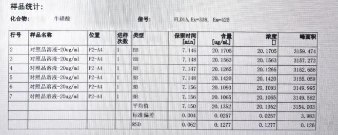 用?;撬針藰幼鲋噩F(xiàn)性實驗,用 20ug/mL 濃度的標樣 6 針,其保留時間的相對標準偏差(RSD)是 0.062%, 峰面積的相對標準偏差(RSD)是 0.126%。